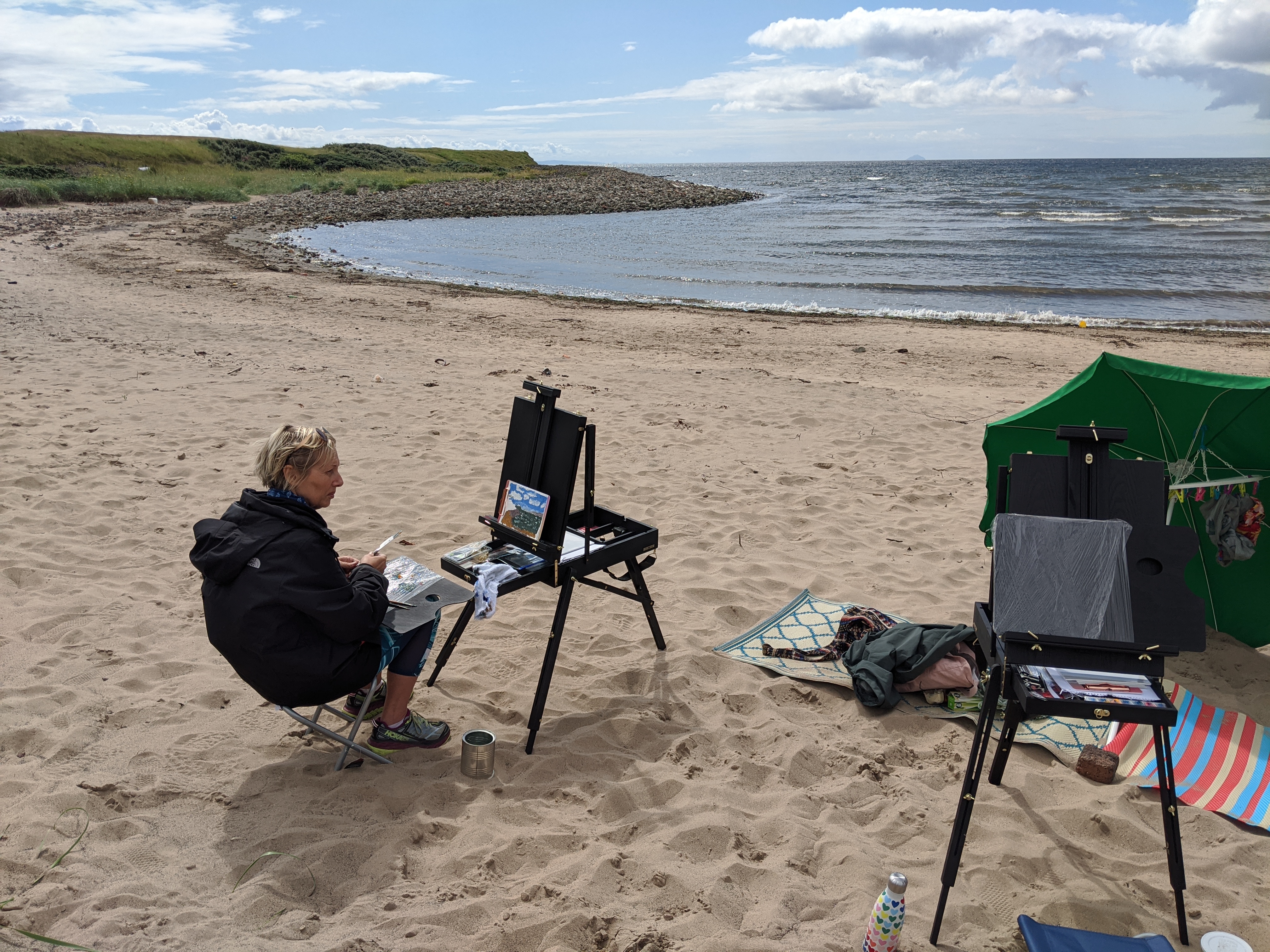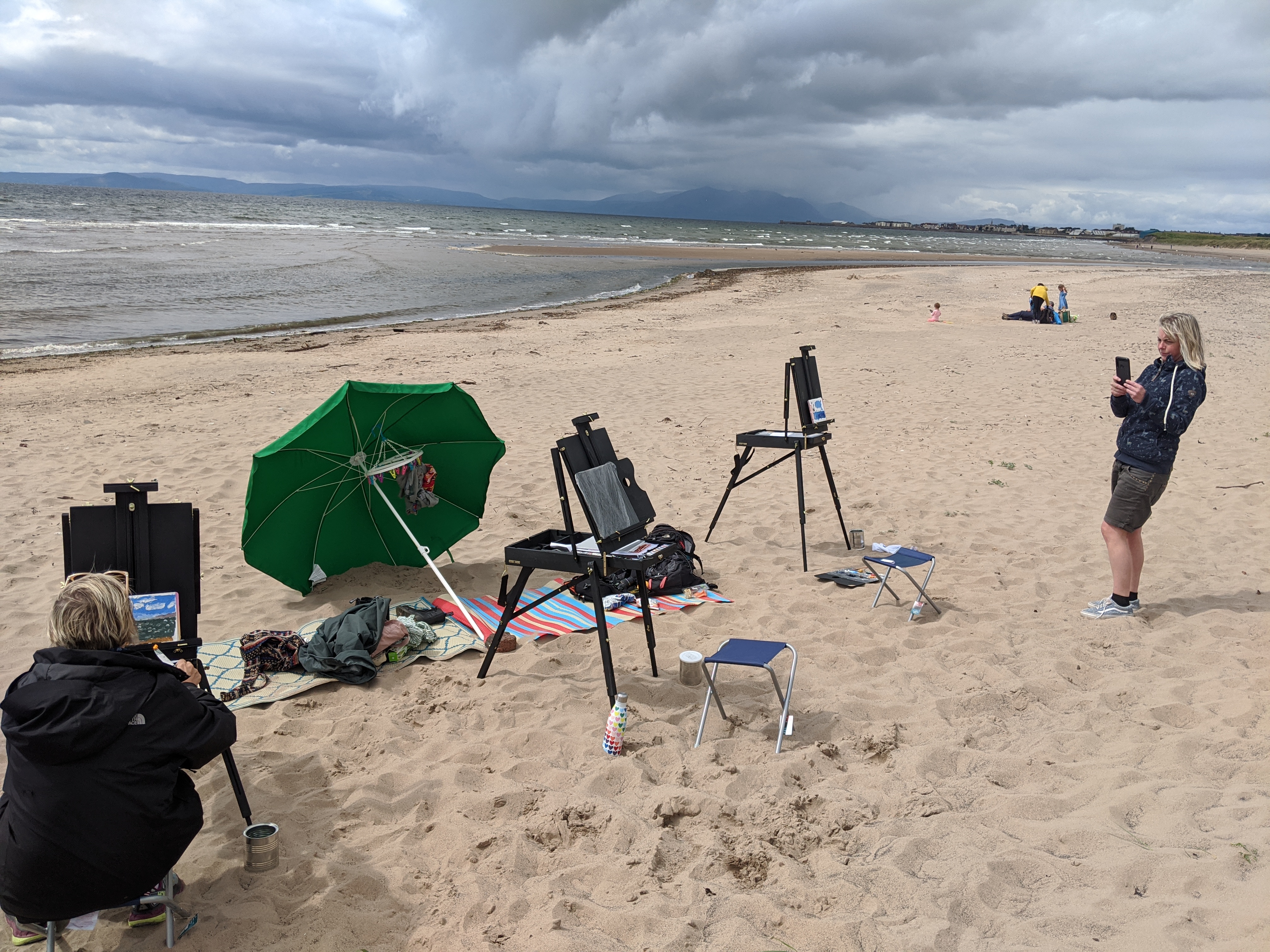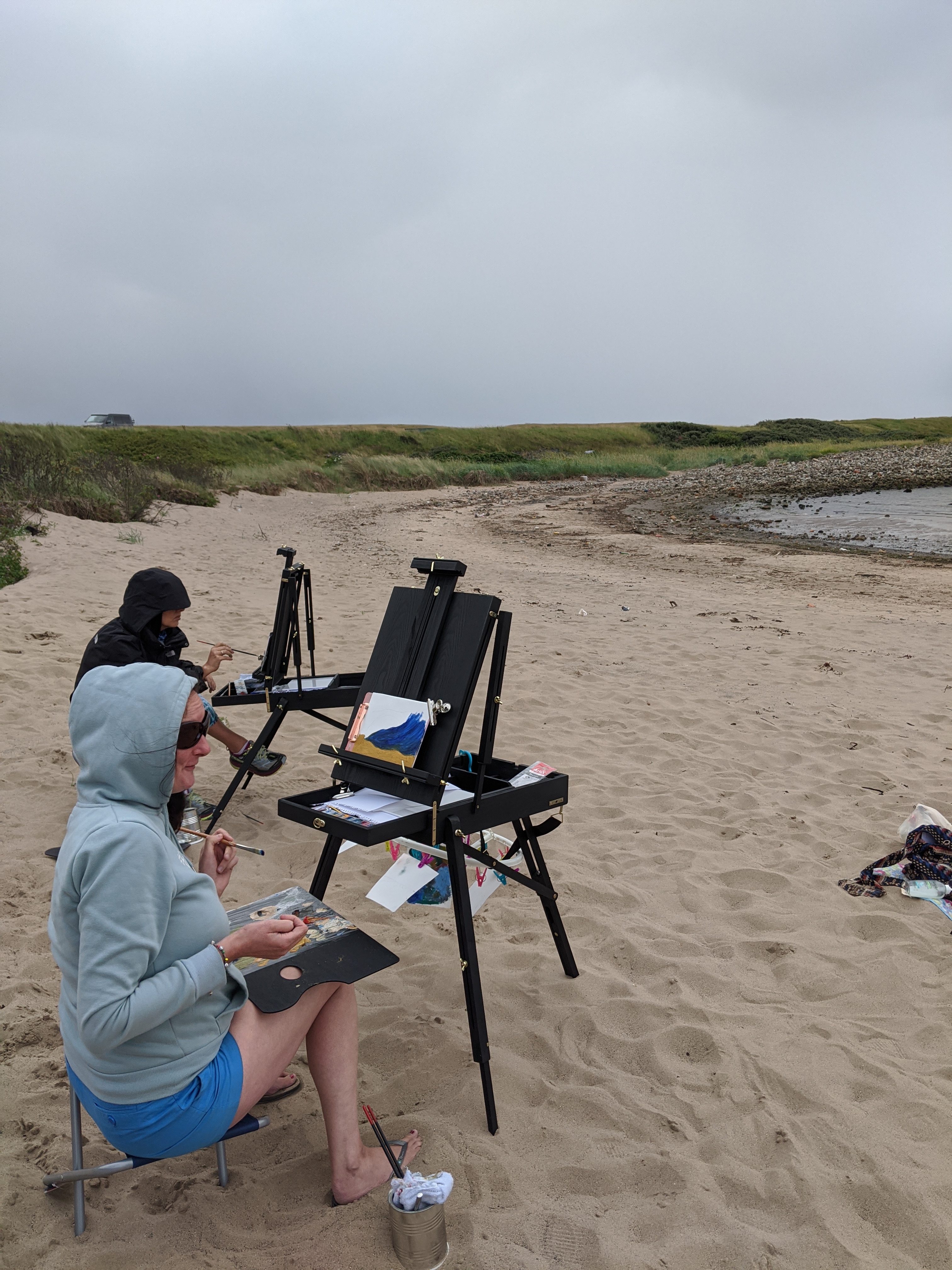 Today I had a full booking of the Wee Dauner coastal painting. We enjoyed exploring the beach and capturing the different light and shadows in oils as the tide pulled back. Beautiful restful and rejuvenating day with Laura Edwards creative director of looptheatre.org, Angela Dickson of yoga71 and mindfulness tutor Gemma Cummins .Feeling thankful we crossed paths and well done in creating some amazing work you’ll treasure forever. Thanks ladies, you did great.