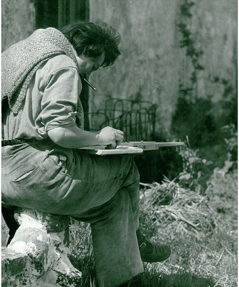 Eardley painted on location, often during wild storms, using oil and boat paint mixed with newspaper, sand and grasses on hardboard, as captured in Audrey Walker’s photograph Eardley painting facing the sea on the shore at Catterline, 1950